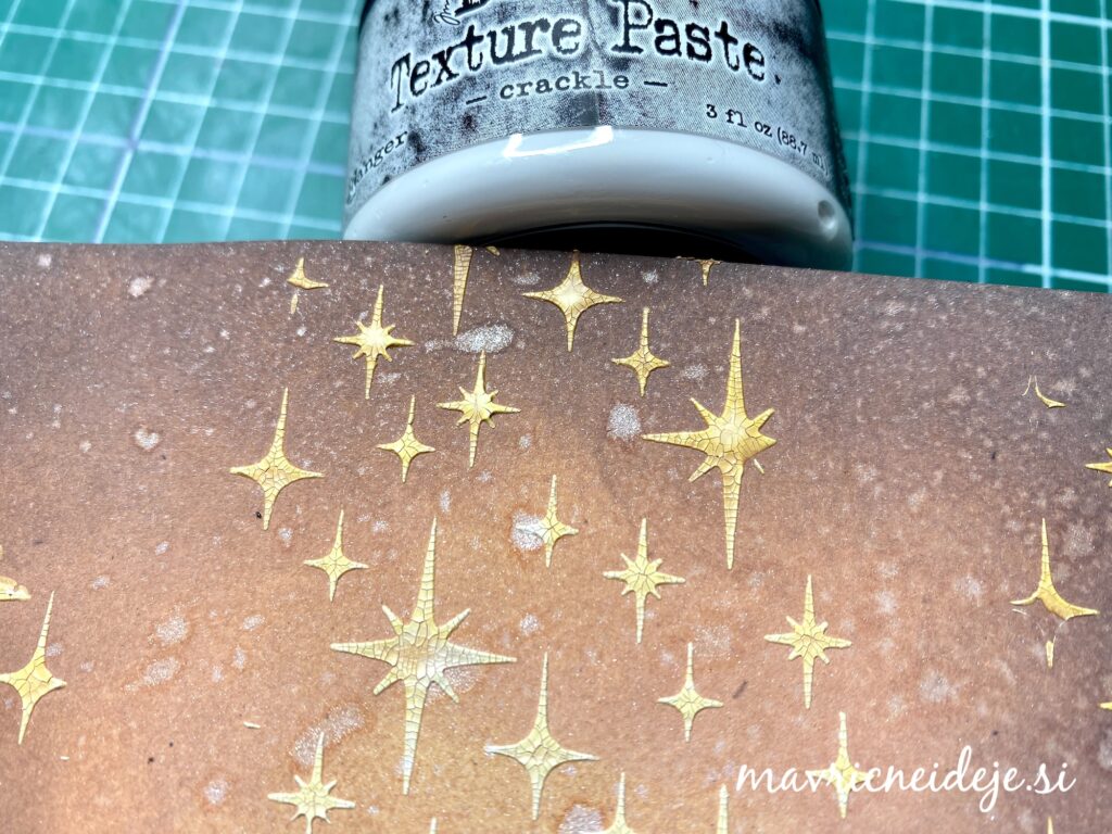 Nato sem preko stencil šablone nanesla Ranger Texture Paste Crackle. Tako Oxidi kot pasta so na vodni osnovi, zato zvezde postale rumenkasto rjave.