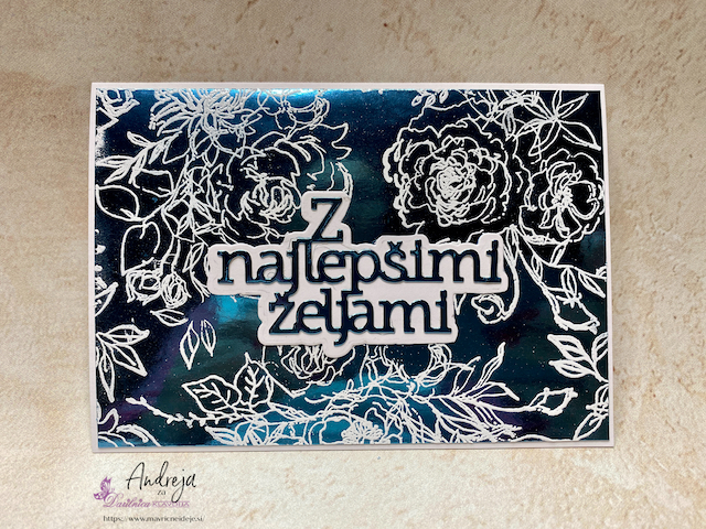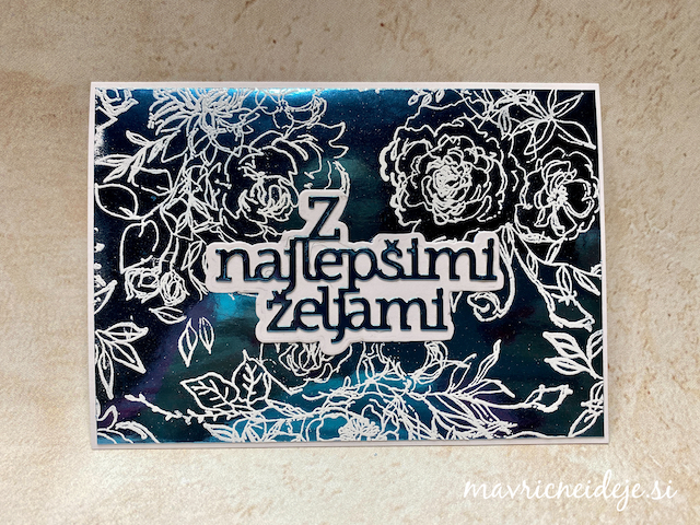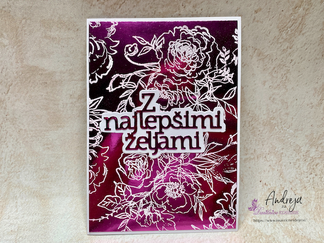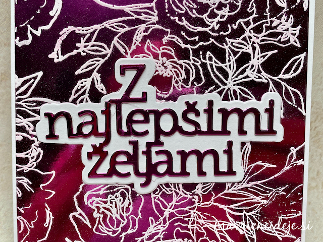 Embosiran motiv sem izrezala s pripadajočimi šablonami. Bel papir sem suho embosirala v teksturni srajčki iz istega seta in ga podložila z zlato obrobo.