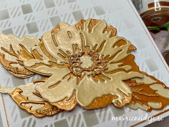 Na pobarvan motiv sem nanesla antistatični prah, nato pa pdtis ponovila z embosing blazinico. Uporabila sem zlat prah in vse učvrstila z grelno napravo.