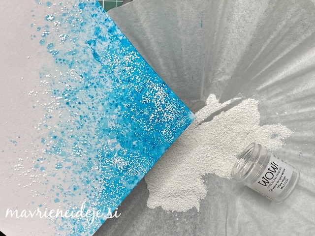 Med dve plasti peki papirja sem natresla različne zelene odtenke WOW! prahcev in prelikala z likalnikom. Prah se med dvema plastema peki papirja stali in ko se ohladi dobomo zanimive vzorce na zelo tanki masi.