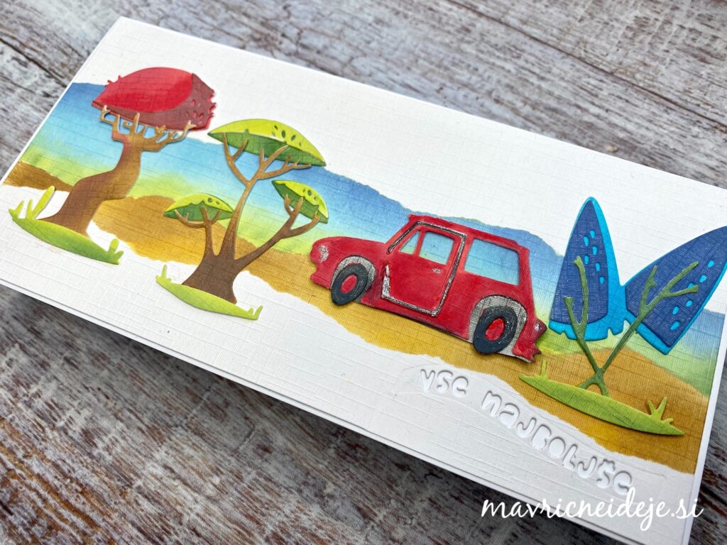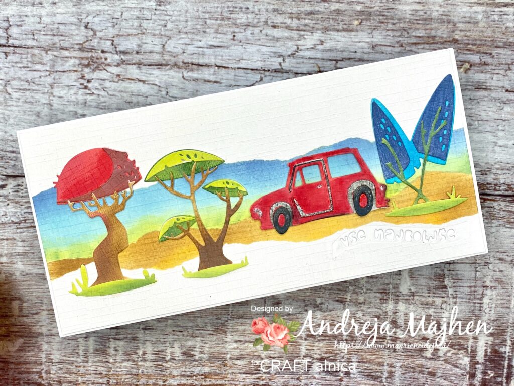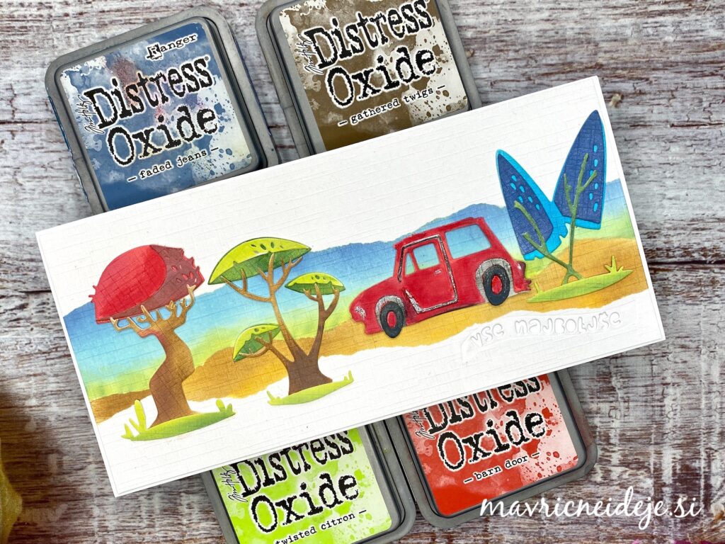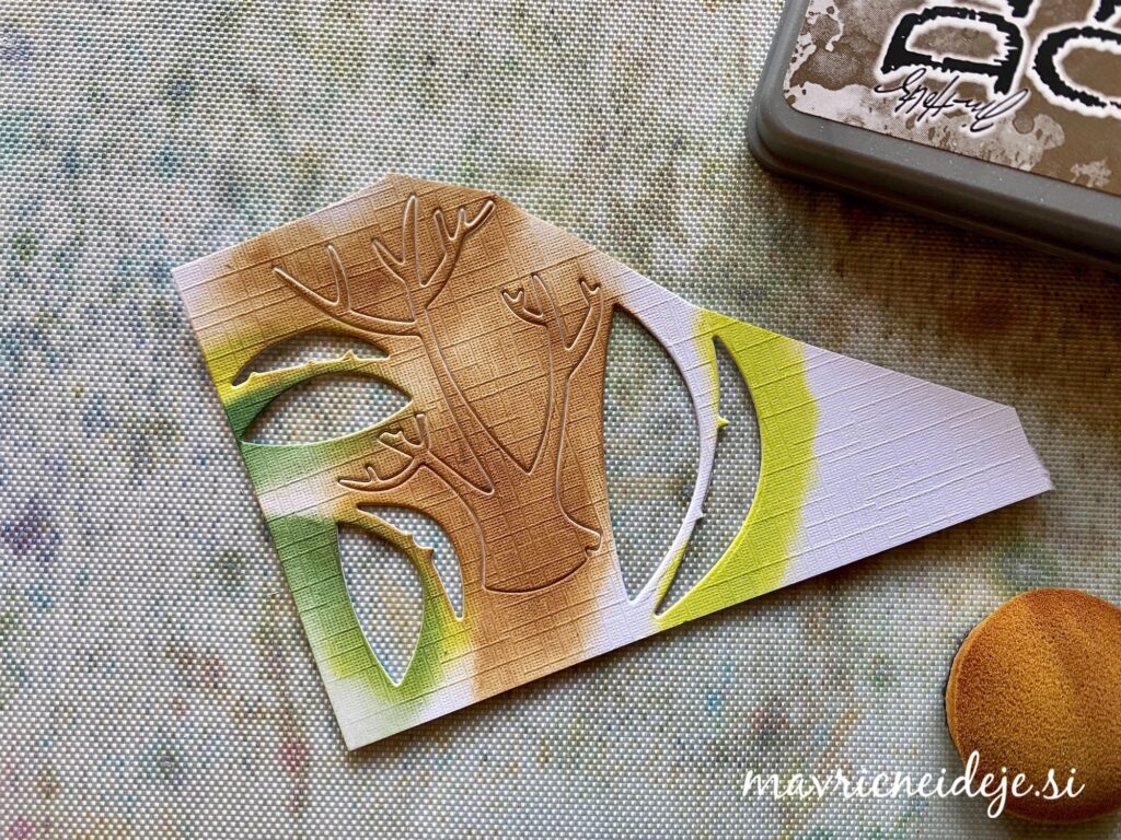 Glavni motiv sem vroče embosirala in pobarvala z Distress barvicami. Navadila sem se, da si pripravim dva odtisa, drugi je za rezervo.